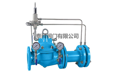 當(dāng)閥門從進(jìn)口端給水時(shí),水流過(guò)針閥進(jìn)入主閥控制室,并經(jīng)過(guò)導(dǎo)閥、球閥流出主閥控制室到出口,此時(shí)主閥處于全開或浮動(dòng)狀態(tài)。調(diào)定主閥上部的流量調(diào)節(jié)閥,可為主閥設(shè)定一定開度。調(diào)節(jié)針閥開度和調(diào)節(jié)導(dǎo)閥彈簧壓力,即可使主閥開度保持在設(shè)定開度,并在壓力變化時(shí)導(dǎo)閥進(jìn)行自動(dòng)調(diào)節(jié),保持流量不變。